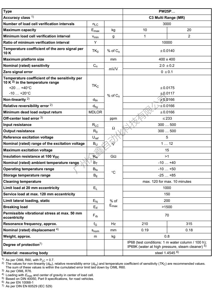 五、PW25PC3稱重傳感器技術(shù)參數(shù)