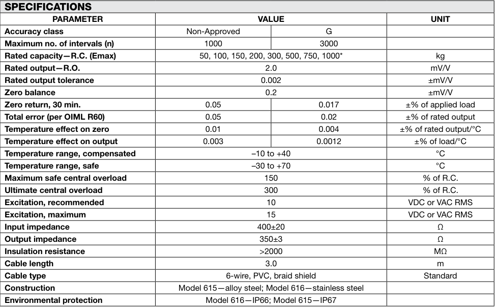 Tedea-Huntleigh特迪亞615系列技術(shù)指標(biāo)