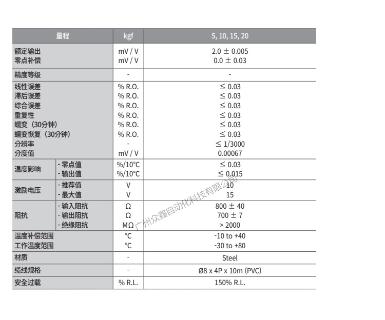 五、韓國凱士CAS品牌 DES-B-20T稱重傳感器技術(shù)參數(shù)