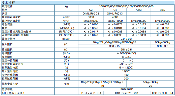 中航電測ZEMIC傳感器BM6G系列所有量程如下: