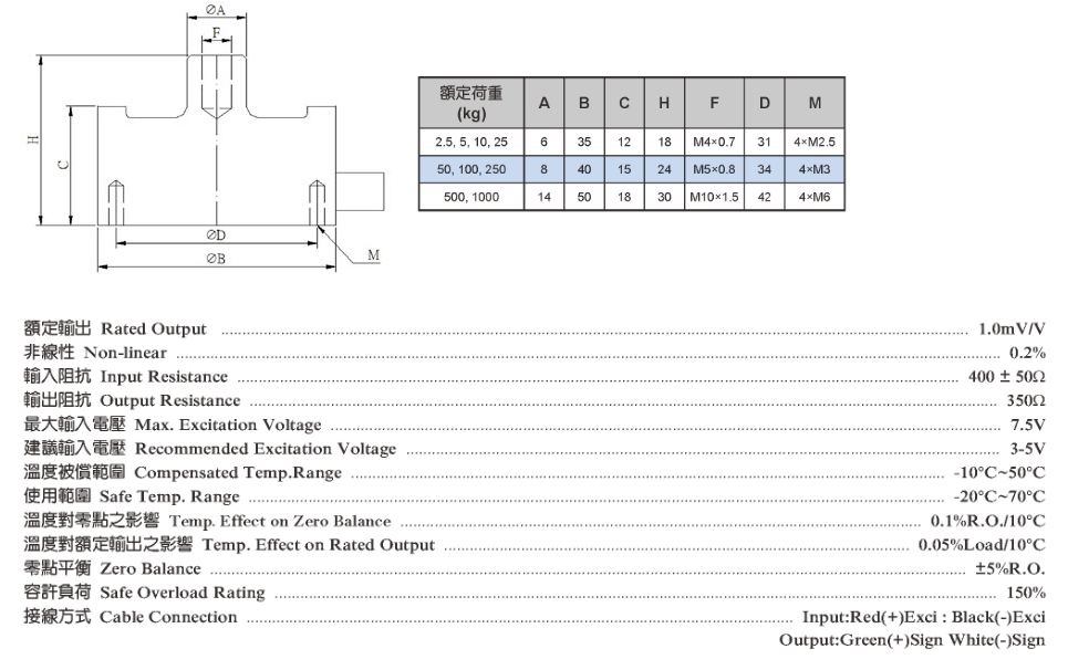 MLT荷重元係高精度,拉壓雙向力量感測器,使用應變規(guī)為感測元件,變形 量小,精度高;所有感測電路均藏於金屬彈性體內(nèi),完全密封保護,不受外界干 擾,穩(wěn)定性高;具以下之特點:  拉壓雙向 剛性強 溫度補償 整體密封保護
