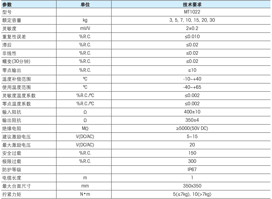 Mettler Toledo梅特勒托利多MT1022系列技術指標