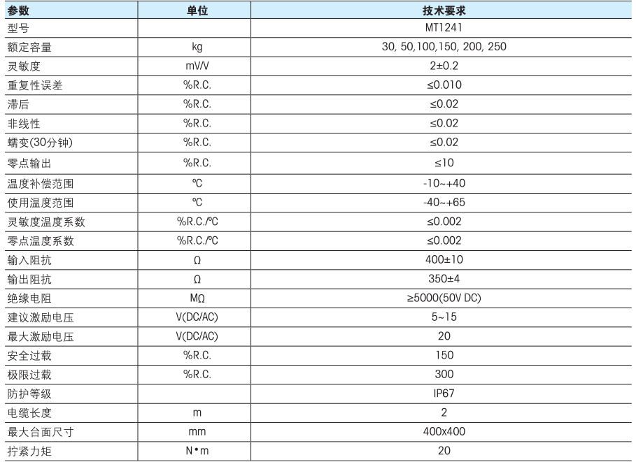 稱重傳感器相關(guān)型號(hào):MT1241-50kg,MT1241-100kg,MT1241-150kg,MT1241-200kg,MT1241-250kg。