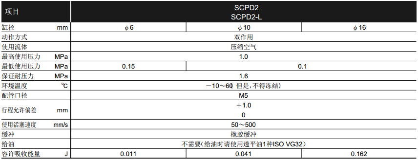 SCPD2 規(guī)格·型號 雙作用·單活塞桿型 ,禁銅處理 6φ, 10φ,16φ
