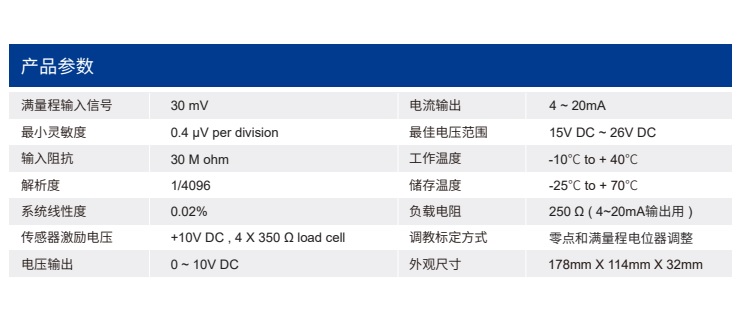 傳感器激勵(lì)電壓:+10V DC , 4 X 350 Ω load cell
