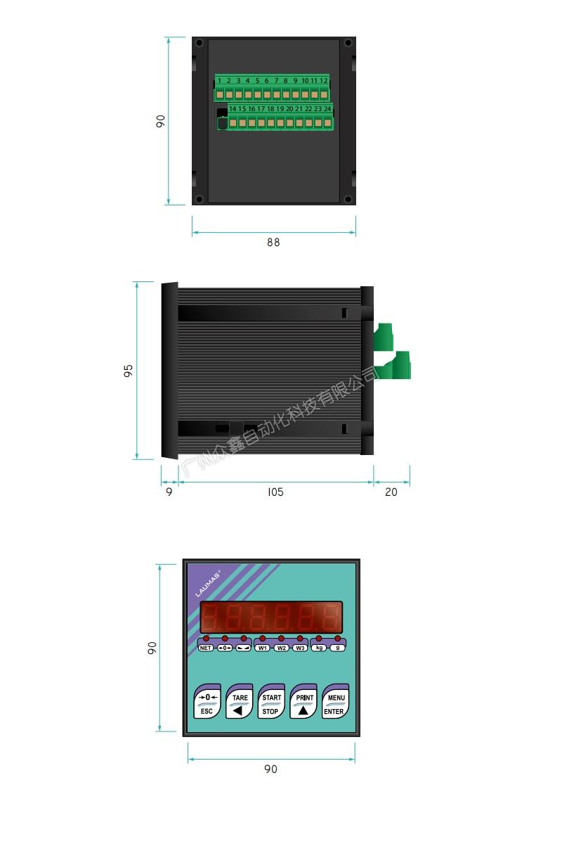 (2)尺寸: 96x96x130 毫米(鉆孔模板:92x92 毫米)。